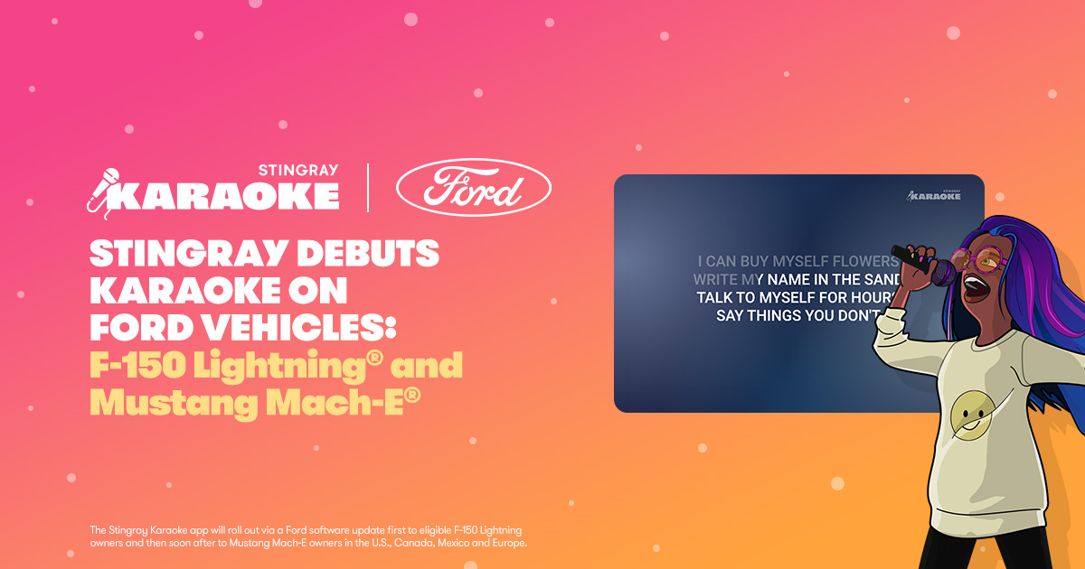 We are thrilled to announce that we’ve partnered with Ford to launch Stingray Karaoke, starting with the all-electric F-150® Lightning® and Mustang Mach-E®, with more vehicles to follow. This marks the first time our karaoke service is available for Ford owners to enjoy inside their vehicles.
